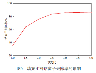 填充比是影響陰極表面積擴展的重要因素。在填充材料為空心鋼球、電流為0.6 A、不調節(jié)廢水pH的條件下,電解時間為60 min時,填充比對鈷離子去除率的影響見圖5。