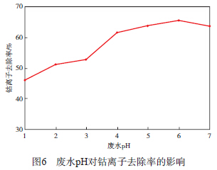 將6 L廢水注入電解槽與循環(huán)槽,并經蠕動計量泵循環(huán)運行,加入鹽酸或氫氧化鈉溶液調節(jié)廢水pH。電極間距設定為5 cm,電解60 min,每隔10min取樣測定。實驗結束后,對沉積于陰極板上的金屬鈷進行干燥回收。