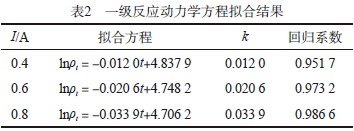 在填充材料為空心鋼球、填充比為2.5、不調節(jié)廢水pH的條件下,對不同電流下鈷離子質量濃度隨電解時間的變化數(shù)據(jù)進行一級反應動力學方程(見式(2))擬合,結果見表2。由表2可見,3種電流下的回歸系數(shù)均大于0.95,表明線性相關性顯著,假設成立。