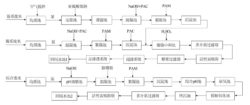 A/O法處理后的綜合廢水經沉淀后,再通過多介質過濾塔-活性炭吸附系統進行深度處理。為了進一步提高對廢水中有機物和色度的去除率,活性炭吸附塔采用與含鉻鎳廢水處理工藝中類似的改性活性炭-鐵屑處理方法。出水進入回用水池用于前制程用水或達標排放。具體處理工藝如圖 1 所示。