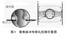 聚焦脈沖(FP)技術盡管在醫學破壁和食物殺菌方面為人所熟知[13-14],但對其提高厭氧消化效率方面的研究仍較少。聚焦脈沖在水中電弧放電,可以產生沖擊波、紫外線輻射以及各種自由基[15],同時在高壓條件下,細胞膜會產生電穿孔[16],這些都可以促使污泥細胞破碎,溶出胞內有機物。研究[17-20]表明: ①當采用較弱的電場時,可使細胞膜形成可逆電擊穿,即電場所誘導的細胞膜電穿孔在一定條件下可以重新封閉; ②隨著電場強度的增大,細胞膜孔數增多,孔徑增大,當達到一定程度后膜孔就不能再封閉,從而造成不可逆擊穿,使細胞死亡、破裂。在污泥預處理中,主要是運用電場對細胞膜不可逆擊穿原理。20 世紀60 年代后期,Sale等[21-22]首次采用多個高壓電脈沖對微生物細胞進行處理,發現細胞在電場作用下溶解或死亡。聚焦脈沖電穿孔機理見圖1[23]。圖1 中,正負電極分別與聚焦脈沖電源和地面連接,絕緣的細胞膜在快速變化的電場中發生極化。這是由于磷脂分子是極性分子,隨著電荷的積累,膜間電壓升高。如果膜間電壓超過了某一閾值,細胞膜間由于引力引起的壓力就會破壞磷脂雙分子層而形成小孔。