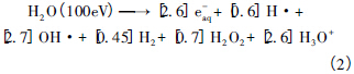 電子束預處理技術不需要添加額外的化學試劑,不生成副產物,并且可以通過由輻射產生的OH·來降解有毒難處理的物質[49]。當高能電子束輻射純水時,在10-7s 內發生化學反應[50]: