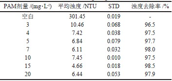 取已編號(hào)的200 mL 燒杯,分別加入攪拌均勻的150 g一號(hào)廢水。將燒杯放在攪拌器下,分別準(zhǔn)確加入3、4、5、7、10、15、20 mg/L 的PAM 后,快攪(300 r/min)2 min,慢攪(240 r/min)8 min 后靜置60 min,分別測(cè)定其濁度和COD。