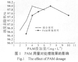 結(jié)合工業(yè)應(yīng)用的實(shí)際情況,定性討論了處理廢水的成本問題。由于PAM 的價(jià)格遠(yuǎn)高于硫酸鋁,考察了PAM 用量對(duì)處理效果的影響如圖1 所示。
