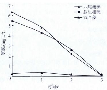 試驗在柱式光合反應器中進行,四尾柵藻、斜生柵藻、混合藻采用優化后的條件參數進行培養,監測廢水氨氮的去除情況,結果如圖 2 所示。