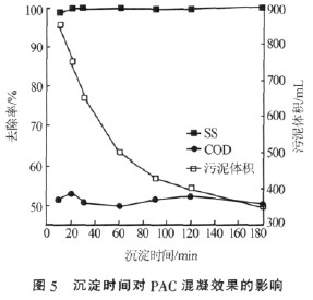 混凝后的沉淀時間取決于絮體沉降速度的快慢,該指標決定了沉淀構筑物的大小,對于工藝的實際應用有重要意義。實驗從污染物去除效率和沉淀污泥體積的角度,考察了PAC 混凝中纖板廢水最佳的沉淀時間,結果見圖5。