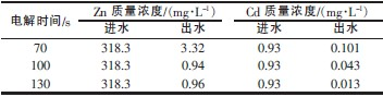 以小試研究為基礎,定制了中試設備,處理量達24 m3/d,在小試試驗選擇的最優條件(pH=9,電解時間100 s,電流密度6 mA/cm2)下運行,當Zn2+進水為150 mg/L 左右時,Zn2+出水質量濃度低于0.22 mg/L;Cd2+進水為15 mg/L 左右時,Cd2+出水質量濃度低于0.04 mg/L,達到GB 25466—2010 排放標準要求。具體參見http://m.bnynw.com更多相關技術文檔。
