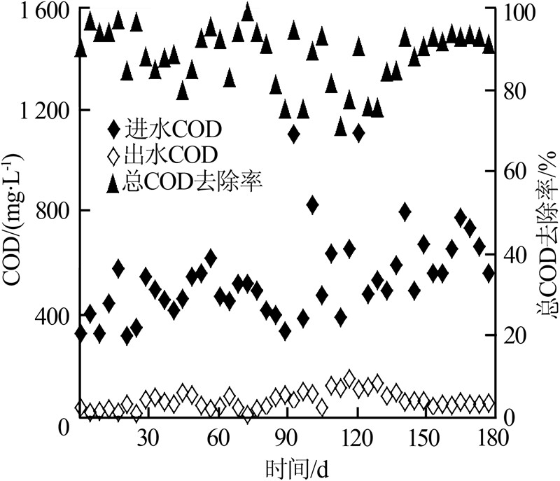 系統進水COD約為350~1 250 mg/L,已超過南方及華北地區一般生活污水的平均COD值,其原因是該污水廠的進水中混合有大量的工業廢水,導致進水負荷波動較大,COD平均值升高。組合工藝運行期間,COD的去除情況如圖 2所示。