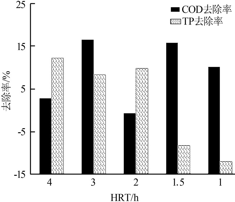 由圖 4可知,HRT為3 h時,水解酸化反應器對COD的平均去除率最高,約為16.5%。當HRT為4 h時,水解酸化反應器對TP的平均去除率最高,約為12.2%;當HRT為3 h時,TP平均去除率有所下降,為8.3%,與HRT為2 h時的TP平均去除率9.8%相差不大。水解酸化反應器的HRT比一般的厭氧反應器短,故釋磷作用不明顯,同化代謝去除污水中TP的量要大于釋磷的量。綜合考慮COD和TP的去除情況,當HRT為3 h時,水解酸化反應器的運行效果最佳。水解酸化反應器對混合型城市污水有較好的預處理效果。