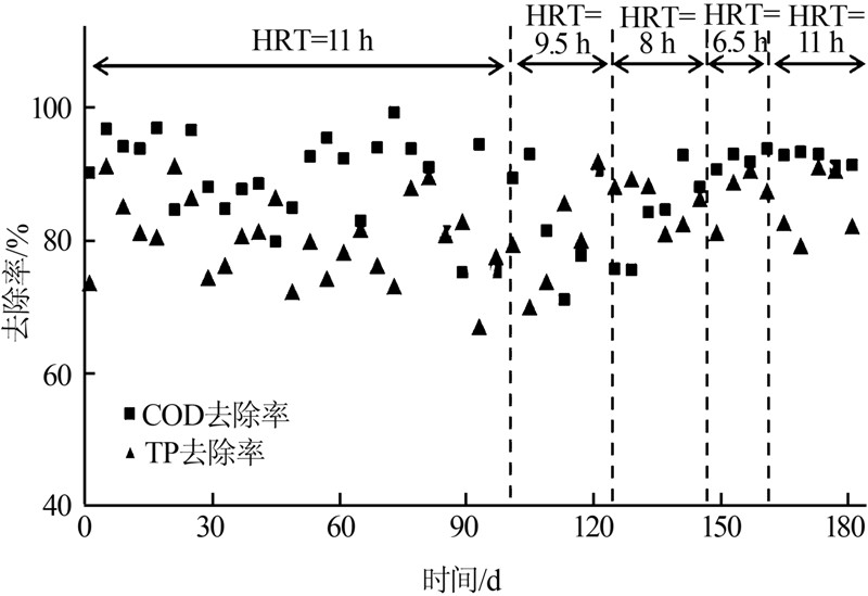 由圖 5可知,試驗的前100 d,改良氧化溝對COD的去除效果比較穩定,COD平均去除率約為91.4%。當HRT改變為9.5、8 h時,COD平均去除率約為81.7%,COD去除率下降;當HRT為6.5 h時,改良氧化溝對COD的去除效果也較好,平均COD去除率約為90.1%。綜合考慮改良氧化溝的出水水質,當HRT為11 h時,出水COD為10~80 mg/L,出水COD基本可以達到GB 18918—2002的一級A標準;當HRT為6.5 h時,出水COD多高于150 mg/L;當HRT為8、9.5 h時,出水COD>100 mg/L。因此,HRT約為11 h時,改良Carrousel氧化溝對COD的去除效果最佳。改良氧化溝對TP的平均去除率在不同的HRT下變化不大,但當HRT約為11 h時,出水TP除個別天數外,基本都低于1 mg/L,達到GB 18918—2002的一級B標準。