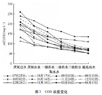1) 進水ρ(COD) 波動較大,最高可達260 mg/L,最低為113 mg/L。整體來看,自厭氧池進水至濕地出水,COD 濃度呈逐漸降低趨勢,尤其是在二級跌水前,COD 濃度降幅較大。隨著季節變化,COD 去除率明顯提升,一般均保持在60%以上,最高可達73. 3%。具體參見http://m.bnynw.com更多相關技術文檔。