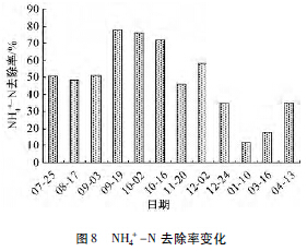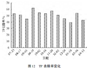 由圖6 可見: 9—12月初,盡管進水TN 濃度較高,但去除率均在50% 以上,其中最高可達65. 3%。冬季和早春,盡管進水中TN 濃度較低,但去除效率整體偏低,其中,最低出現在2013 年1月10 日,TN去除率僅為6. 1%。分析認為,12月初之前,一方面氣溫整體偏高,無論是厭氧菌或好氧菌群數量多,活性高,硝化反硝化較為充分; 另一方面,植物正處成熟期,對氮素吸收能力較強。12月初之后,微生物活性及數量大大降低,同時植物也已枯萎,因此去除率相應降低。