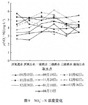 由圖7 可知: ρ(NH4+-N) 進水為35~70 mg/L,波動較大,平均濃度約52. 3 mg/L。整體來看,NH4+-N濃度逐漸降低,出水濃度維持在13. 7~40. 0 mg/L,其變化情況與TN 類似,2012 年12月2 日前,降幅較為明顯,12月2 日后降幅較小。另外,從濕地跌水效果來看,每級跌水曝氣對氨氮濃度降低效果相當,充分說明跌水對氨氮硝化作用明顯。