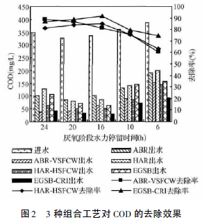(1) 3 種組合工藝對COD 均有較高的去除效果,去除率為60.0%~91.6%。EGSB-CRI 對COD的去除率略高于ABR-VSFCW、HAR-HSFCW。