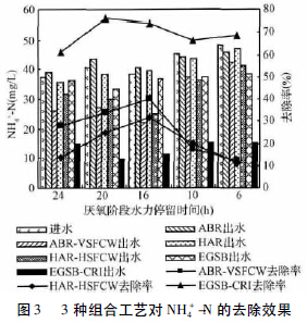 由圖3 可以看出,3種組合工藝對NH4+-N的去除率分別為60.9%~76.1%、12%~42%和11.1%~ 31.9%,EGSB-CRI 對NH4+-N的去除效果最好,ABR-VSFCW 次之,HAR-HSFCW 較差,且好氧段對NH4+-N的去除起主導(dǎo)作用。