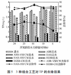 (3 ) ABR-VSFCW、HAR-HSFCW 和EGSB-CRI對TP 的去除率分別為24.7%~44.6%、78.8%~82.6%和76%~84.7%。EGSB-CRI、HAR-HSFCW對TP 的去除率顯著高于ABR-VSFCW。ABR-VSFCW對TP 去除率較低,這主要是由于垂直流人工濕地為落空運行,污水與填料接觸不充分造成的。