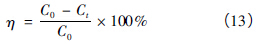 式中: C0為初始時刻硝基苯濃度,mg/L; Ct為t 時刻硝基苯濃度,mg/L。