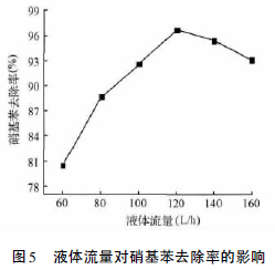 調節水樣的初始pH 值為10.0、超重力因子為80、氣體流量75 L/h、臭氧濃度40 mg/L,保持雙氧水濃度為4.9mmol/L,處理35 min,考察不同液體流量下的硝基苯去除率,結果如圖5 所示。