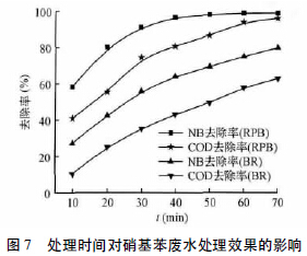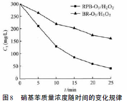 調節水樣的初始pH 值為10.0、氣體流量75 L/h、臭氧濃度40 mg/L、保持雙氧水濃度為4.9mmol/L,分別在曝氣反應裝置(bubbling reactor,簡稱BR)和旋轉填料床(控制超重力因子為80,液體流量120L/h) 中反應,考察處理時間對硝基苯模擬廢水處理效果的影響,結果如圖7 所示。