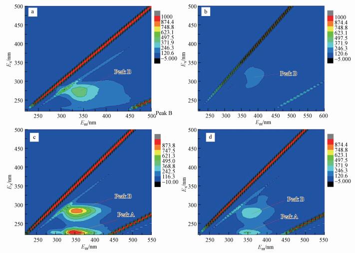 圖 4 好氧顆粒污泥及其EPS熒光光譜譜圖(a. 絮狀活性污泥;b. 絮狀活性污泥EPS;c. 好氧顆粒污泥,d. 好氧顆粒污泥EPS)