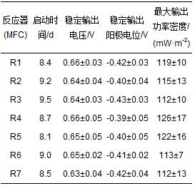 表 1 微生物燃料電池R1~R7反應器啟動期電化學性能