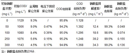 表 2 不同陽極初始硝酸鹽濃度下MFC的庫侖效率及污染物去除情況