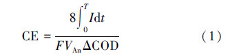 式中,T為一個周期的時間(s),I為電流大小(A),F為法拉第常數(96485 C·mol-1),VAn為陽極室液體體積(L),ΔCOD為周期T內COD的變化值(g·L-1).