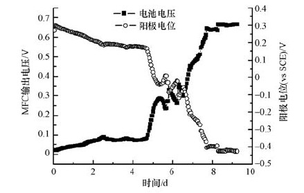 圖 1 微生物燃料電池R1啟動期輸出電壓及陽極電位情況