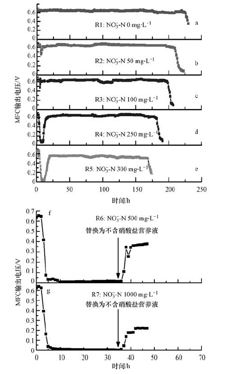 當硝酸鹽濃度升至300 mg·L-1時,如圖 2e所示,其經歷電壓下降段后,電壓升高后的平穩電壓在500 mV左右波動,無法達到初始電壓輸出水平,說明產電生物活性下降;而當初始硝酸鹽濃度升至500 mg·L-1(圖 2f)及1000 mg·L-1(圖 2g)時,MFC輸出電壓均立即出現大幅下降,直至失去電壓輸出能力,且超過30 h未見電壓回升,說明在高濃度的硝酸鹽溶液中,產電生物活性受到了極大的抑制.Gorby等(2006)也研究發現,電子受體的存在會抑制納米導線的產生,從而影響電子傳遞.此外,為了確定高濃度硝酸鹽對產電生物的抑制影響是否可逆,在陽極溶液投加高濃度硝酸鹽35 h后,將陽極溶液更換為不含硝酸鹽的營養液,由圖 2f、圖 2g可知,當更換營養液后,初始硝酸鹽濃度為500和1000 mg·L-1的MFC輸出電壓僅可回升至0.4 V和0.2 V附近,且連續運行3個周期后,最大輸出電壓仍然維持在0.4 V及0.2V左右.說明當陽極初始硝酸鹽濃度過高時,即使后續運行中解除了抑制條件,產電微生物仍然無法完全恢復產電能力,推測是由于高濃度的硝酸鹽對陽極微生物的產電活性造成抑制,破壞了電子產生和傳遞過程,且該抑制對產電活性的影響不可逆.