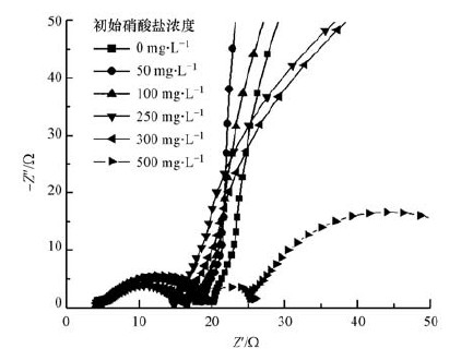 為探究不同硝酸鹽濃度下MFC系統內阻的組成及變化,在陽極室添加硝酸鹽后輸出電壓下降達到最低點時,對其進行電化學阻抗譜(EIS)測試.在復阻抗平面上,將測得阻抗的實部(Z′)作為橫坐標,虛部絕對值(-Z″)作為縱坐標,繪制Nyquist圖.在不同硝酸鹽濃度下MFC的EIS測試結果如圖 3所示.