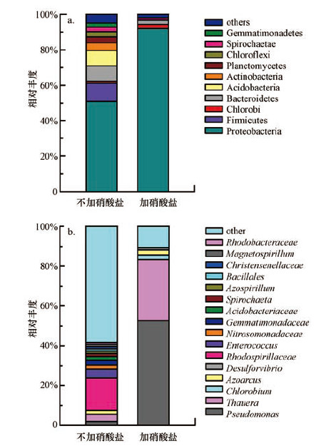 陽極微生物在電子向電極的傳遞及污染物降解轉化的過程中起著至關重要的作用,對不加硝酸鹽的陽極生物膜和加入硝酸鹽濃度為250 mg·L-1的陽極生物膜取樣,對樣品進行Illumina MiSeq測序分析,相關結果如圖 6所示,其中,不加硝酸鹽表示進水中無硝酸鹽,加硝酸鹽表示進水硝酸鹽濃度為250 mg·L-1.