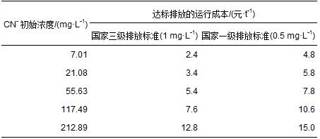 表3 處理不同初始CN-濃度廢水需要的運行成本