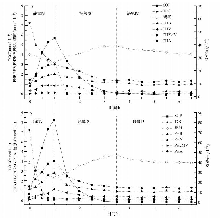 由于靜置段與傳統厭氧段有所不同,而這種差異是否影響微生物代謝,進而影響生物強化除磷效果值得探討.本文將從釋磷、VFA攝取、糖原分解及PHA合成等方面進行分析.運行穩定階段,R1和R2典型周期內SOP、TOC、糖原和PHA(聚β羥基丁酸(PHB)+聚β羥基戊酸(PHV)+聚二甲基三羥基戊酸(PH2MV))一個周期內的變化情況如圖 1所示.