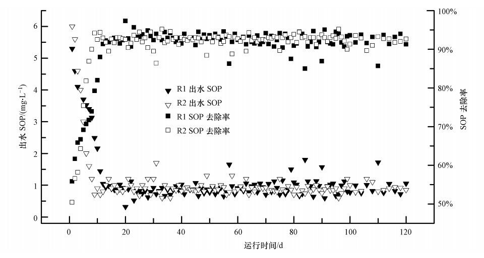PAOs在兩系統好氧段均能迅速吸收廢水中的磷酸鹽.R1、R2中SOP分別從好氧段初的46.67、82.34 mg · L-1下降到好氧段末的2.32、0.93 mg · L-1,其磷酸鹽的平均吸收速率分別為5.90、9.53 mg · g-1 · h-1,R2高于R1.R2厭氧段聚磷菌釋磷更充分,因而攝磷速度更快,好氧段末SOP即在1 mg · L-1以下;而R1靜置段釋磷較R2少,攝磷速度亦相對較慢.從好氧代謝看,R1與R2相同,隨著磷的攝取R1好氧段發生PHA降解與糖原補充,但R2的Glysyn/PHAoxi較R1小(表 2),其原因可能是在R2厭氧段釋磷更多的情況下,R2中聚磷菌氧化PHA所獲能量較多地用于SOP攝取及聚磷合成,而用于糖原補充則相對較少,故Glysyn/PHAoxi較小.雖然R1好氧段末SOP較高,為2.32 mg · L-1,但隨著反硝化進行,SOP逐漸吸收,從而使SOP在缺氧結束時降至0.91 mg · L-1.因此,推斷R1中存在反硝化聚磷菌(DPAOs),能以NO為電子受體攝取SOP(Xu et al., 2011),反硝化攝磷速率為0.18 mg · g-1 · h-1.脫氮的同時使SOP濃度進一步降低,達到與R2相當的除磷效果.R1和R2長期運行過程中的除磷效果見圖 2.由圖 2可知,R1和R2長期運行過程中,除磷效果穩定良好,平均出水濃度分別為0.91和0.93 mg · L-1,平均去除率分別為92.4%和92.1%.與設厭氧段的R2相比,設靜置段的R1具有相當的除磷效果.這表明與厭氧/好氧/缺氧SBR相比,靜置/好氧/缺氧SBR能在長期運行過程中取得與之相當的良好除磷效果.