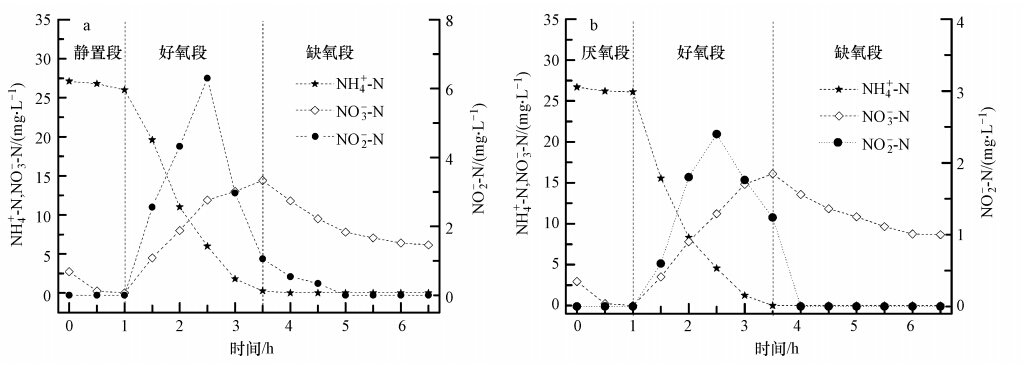 圖 3 R1(a)和R2(b)典型周期內NH+4-N、NO-2-N和NO-3-N的變化