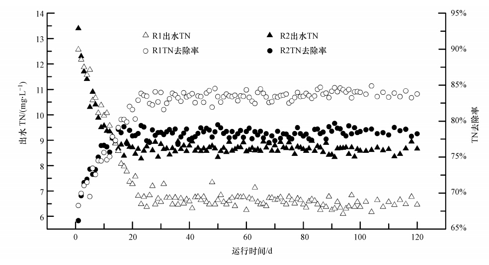 綜合對比R1和R2好氧段和缺氧段脫氮性能發現,設置靜置段的R1比設置厭氧段的R2有更高的同步硝化-反硝化脫氮量和反硝化速率,故在氨氮氧化量幾乎相同情況下,R1硝氮出水濃度較R2低(表 4).因而具有更好的脫氮效果.R1和R2長期運行過程中脫氮效果見圖 4.由圖 4可知,長期運行過程中R1和R2脫氮效果穩定,平均出水TN分別為6.62和9.21 mg · L-1,平均脫氮率分別為83.5%和77.0%.可見,R1脫氮效果好于R2.