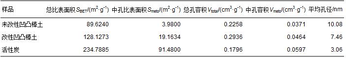 通過比較可以發現,相對于活性炭,改性凹凸棒土的總孔體積和中大孔體積較大,說明改性凹凸棒土的中大孔(>2 nm)比活性炭發達.而中大孔決定著水處理過程中液相吸附速率,因為混凝工藝中一般停留時間不超過30 min,在固-水介質中,中大孔作為接觸載體,為吸附質的擴散提供通道,起到了關鍵作用,吸附質通過此通道才能擴散到微孔中去.