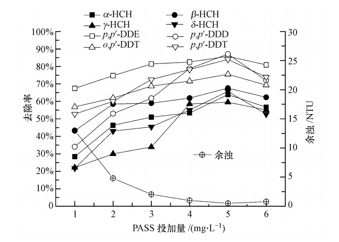 將制備好的水樣置于六聯攪拌器,在不同條件下投加PASS,以120 r · min-1速度快速攪拌2 min,50 r · min-1慢速攪拌15 min,再靜置20 min;取液面2 cm下方清液50 mL,用分光光度法測定余濁,剩余清液和懸浮物經過固相萃取裝置萃取后,再用15 mL二氯甲烷和正己烷洗脫液進行洗脫,干燥除水后濃縮定容,用帶電子捕獲器的氣相色譜儀測定其中OCPs的含量.實驗重復3次,取其平均值.