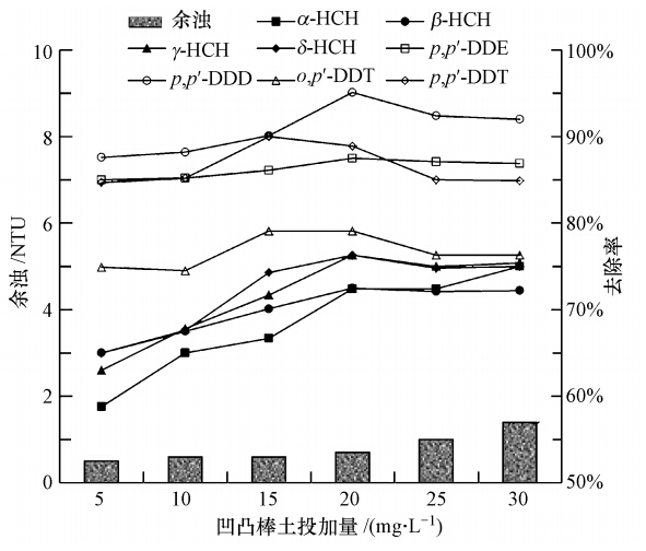 由圖 5可知,隨著凹凸棒土投加量的增多,水中OCPs去除率逐漸上升,但濁度去除率逐漸略有下降;當凹凸棒土的復配量達到20 mg · L-1時,OCPs去除效果最好;當凹凸棒土投加量較少時,凹凸棒土的吸附容量不足,強化混凝效果不明顯;隨著凹凸棒土投加量的增大,吸附點位增多,吸附能力得到提高,去除率隨著提高(韓珊珊,2011).但當凹凸棒土投加量過多時,混凝劑顯得不足,余濁上升,OCPs去除率隨之下降.