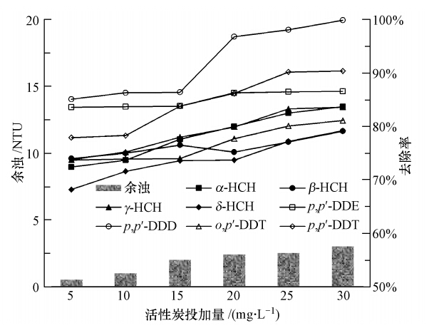 圖 4結果表明,隨著活性炭投加量的增多,水中OCPs去除率逐漸上升,但濁度去除率逐漸下降.與圖 1比較可以證明,以粉末活性炭為助凝劑可以提高OCPs的去除率,達78%~100%.這是因為當活性炭投入水中后,OCPs與活性炭表面相結合,在投加PASS后,形成大量的高電荷多核鋁羥基絡離子和鋁硅聚合物,其混凝作用使吸附有OCPs的活性炭粉末沉淀分離,從而達到較高的去除率.