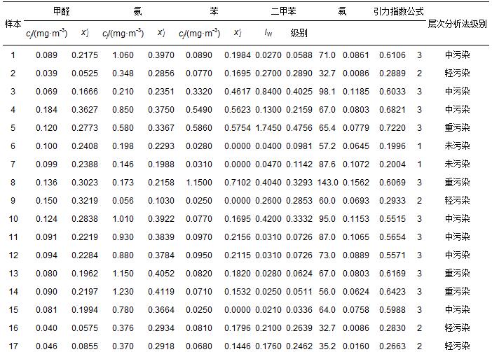 表 11 長春市30個室內樣本監測數據cj及其規范值 x′j和評價結果