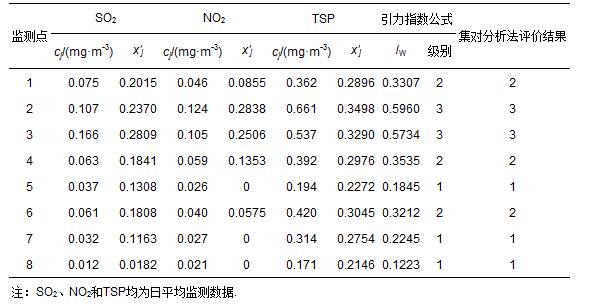武漢市不同測點的空氣指標日平均濃度監測數據cj(郭紹英等,2009),以及由式(1)和式(6)計算出的指標規范值x′j如表 10所示.在視各指標為等權的情況下,將表 10中的3項指標規范值x′j分別代入式(11)和式(12)所示的引力指數公式,計算得到武漢市各測點空氣質量引力綜合指數值,并根據表 3中空氣環境質量綜合指數值分級標準作出的判斷結果(表 10).表中還列出了參考文獻(郭紹英等,2009)中用集對分析法作出的評價結果.可以看出,引力指數公式評價結果與集對分析評價結果完全一致.