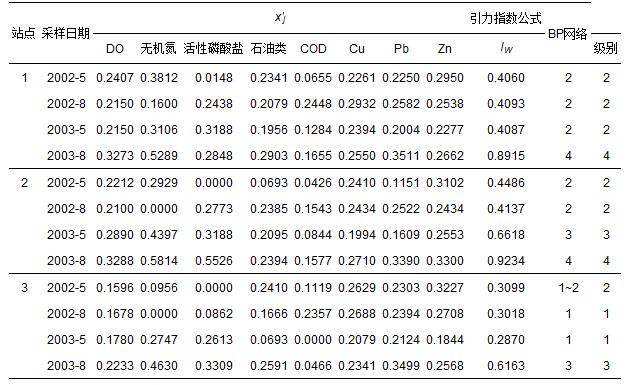珠江口2002—2003年3個站點8項海水指標監測數據cj(李占東等,2005)如表 7所示.由式(1)和式(4)計算出的指標規范值x′j如表 8所示.由于站點1的2003-8和站點2的2002-5,2002-8和2003-5樣本不同指標的規范值x′j相差較大,因而需用式(13)對引力指數值進行加權計算外.其余日期采樣點則視各指標為等權,再用式(10)和式(12)計算得到各站點海水水質引力綜合指數值,并根據表 3中海水水質引力指數分級標準做出評價結果(表 8).表中還列出文獻(李占東等,2005)中用BP人工神經網絡評價法做出的評價結果.可以看出,全部12個樣本2種方法的評價級別完全一致.