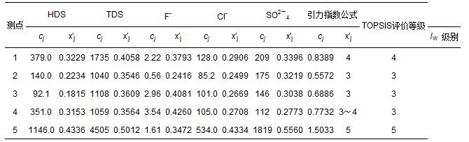 豐縣5個監測點的5項地下水指標監測數據cj(劉洪等,2009),以及由式(1)和式(3)計算得到的指標規范值x′j如表 6所示.在視各指標為等權情況下,用式(10)和式(12)計算得到各監測點水質引力綜合指數的指數值,并根據表 3中3類陸地水體的綜合指數值分級標準做出水質類別判斷結果(表 6).表中還列出文獻(劉洪等,2009)中用多屬性決策分析法(TOPSIS)做出的評價結果,可以看出,2種方法做出的評價結果完全一致.