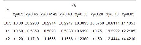 -1≈0.4142時,Sc有極小值0.5828n.由于變換式(2)~(7)中,對多數指標只取n=±2、±1、±0.5.而公式(10)和式(11)中,x′j 取值范圍為x′j∈[0,0.5](對水體),x′j∈[0,0.4](對空氣).當n為上述值時,x′j 分別取為如表 4所示值時,由式(21)計算得靈敏度Sc值如表 4所示.