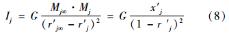 式中,Mj和Mj∞分別為指標j的樣本“規范質量”和“參照級”樣本“規范質量”;r′j為指標j的樣本的“規范坐標”,顯然r′j=x′j;G為環境質量引力常數,其取值大小只是為了控制指數Ij的尺度范圍,對評價結果無任何影響,為簡單起見,在此取G=1.從而式(8)可表示為: