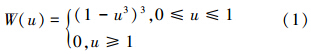 基于距離越近、相關性越強的假設,賦予不同位置的點不同的權重并進行局部加權回歸.該過程需要選定局部回歸的窗口長度、回歸方程階數(d)及權重函數(W),常采用立方權重函數: