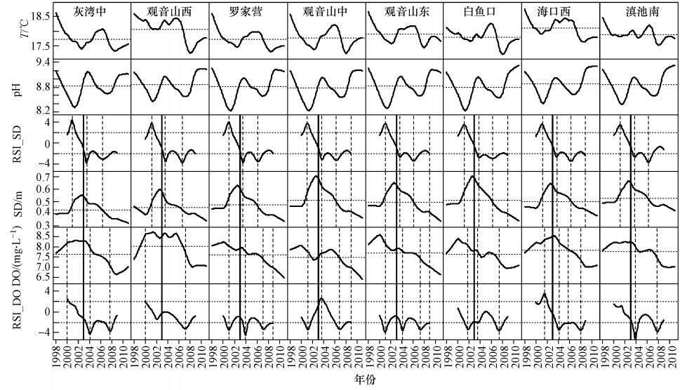 從SD變化趨勢圖上看,各個站點的變化趨勢一致,在2000年2月之前緩慢下降,至2002年8月(海口西在2003年1月)升高并達到最大值,之后一直呈下降趨勢,并在2010年底達到13年來最低值.在空間分布上,以滇池南最高、灰灣中最低.分析RSI的結果可知,SD在2000年1月附近顯著上升,之后到2004年1月附近顯著下降,期間為穩定的高值狀態,之后又有顯著下降的時間點,2008年1月之后為穩定低值.