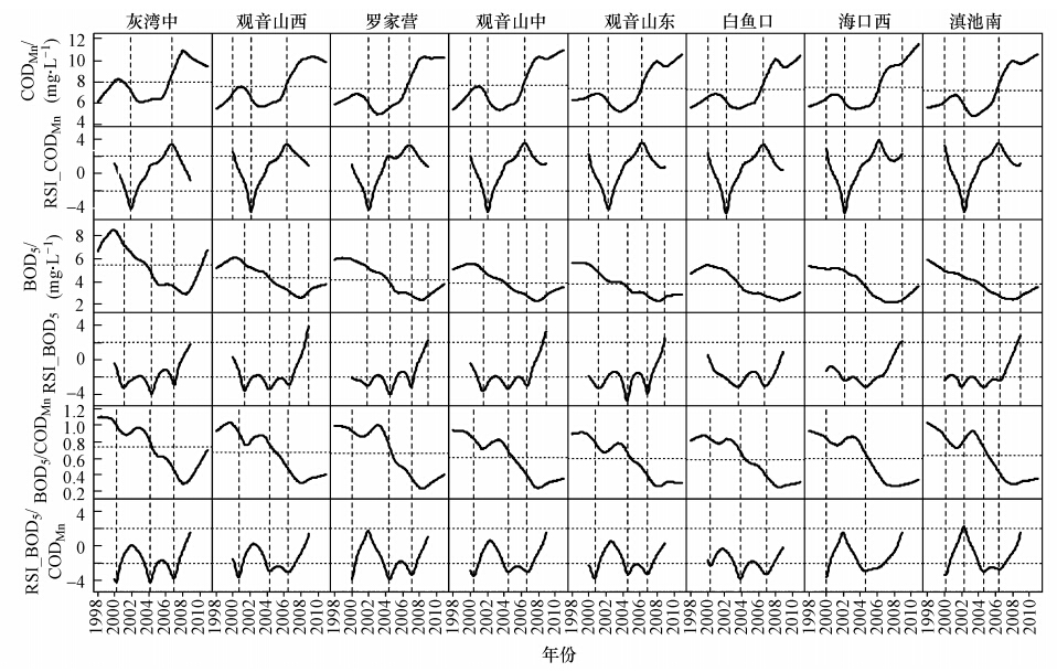 圖 4展示了CODMn、BOD5及BOD5/CODMn的趨勢和RSI分析結果.從CODMn趨勢圖上看,各站點總體趨勢一致,平均值在8 mg · L-1左右,站點間相差很小,2006年之前在低于平均值水平下先增加后減小再增加,2006年前后迅速增長,2008年后雖然各個站點的變化趨勢不同,但仍維持在近13年的較高水平.1998—2010年的CODMn平均水平達到IV類水質標準,2010年底水平為V類標準.從RSI圖上看,在2002年1月附近存在顯著下降的區域,在2006年3—7月附近存在顯著上升的區域,結合趨勢圖可見,CODMn在2006年之前經歷了低于13年平均值的較高水平和較低水平兩個穩定狀態;2006年后,開始顯著上升,并維持在高于13年平均值的高值水平;13年總體趨勢顯著上升.