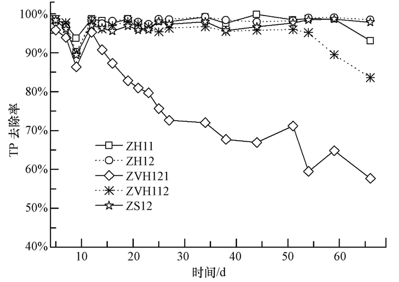圖 6展示了反應器運行前70 d,各反應器中TP去除率的情況.ZH12、ZH11、ZS12填料組合對磷一直保持著較高的去除率,而ZVH121、ZVH112填料組合在運行期間磷去除率的降低,是因為在該組合中空心磚含量較少,在反應器運行一段時間后,反應器中的空心磚對磷吸附達到飽和.含鋼渣的ZS12組合對磷的去除效果穩定且較高,但相比較于其他污染物的去除,鋼渣并不適于在人工濕地處理含磷較低廢水的工程中應用.而空心磚不僅能有效地去除磷,且對氮的去除無明顯負作用,適合添加到填料組合中,在不影響其它污染物去除效果的同時,用于提高人工濕地中磷的去除效果.具體參見污水寶商城資料或http://m.bnynw.com更多相關技術文檔。